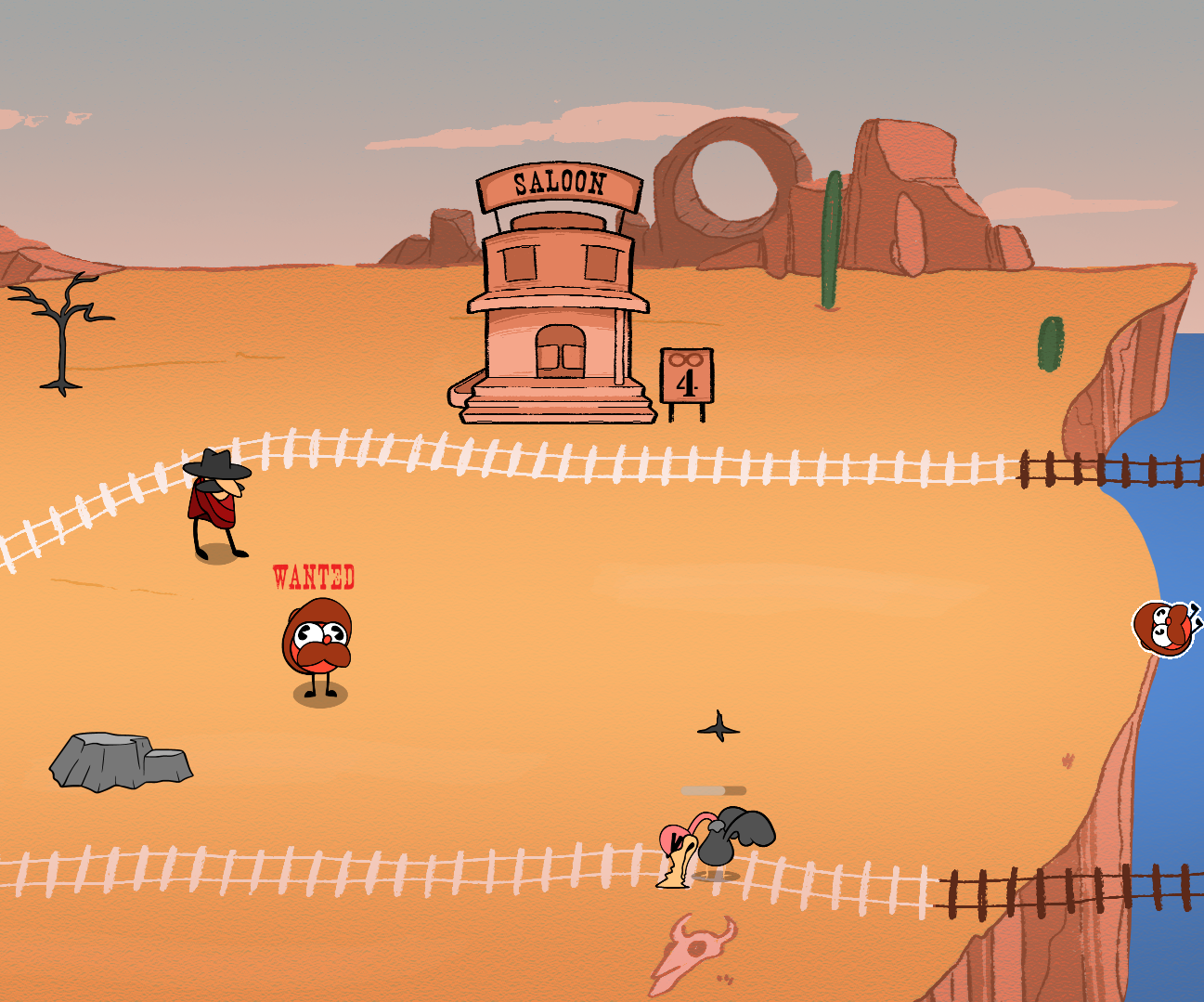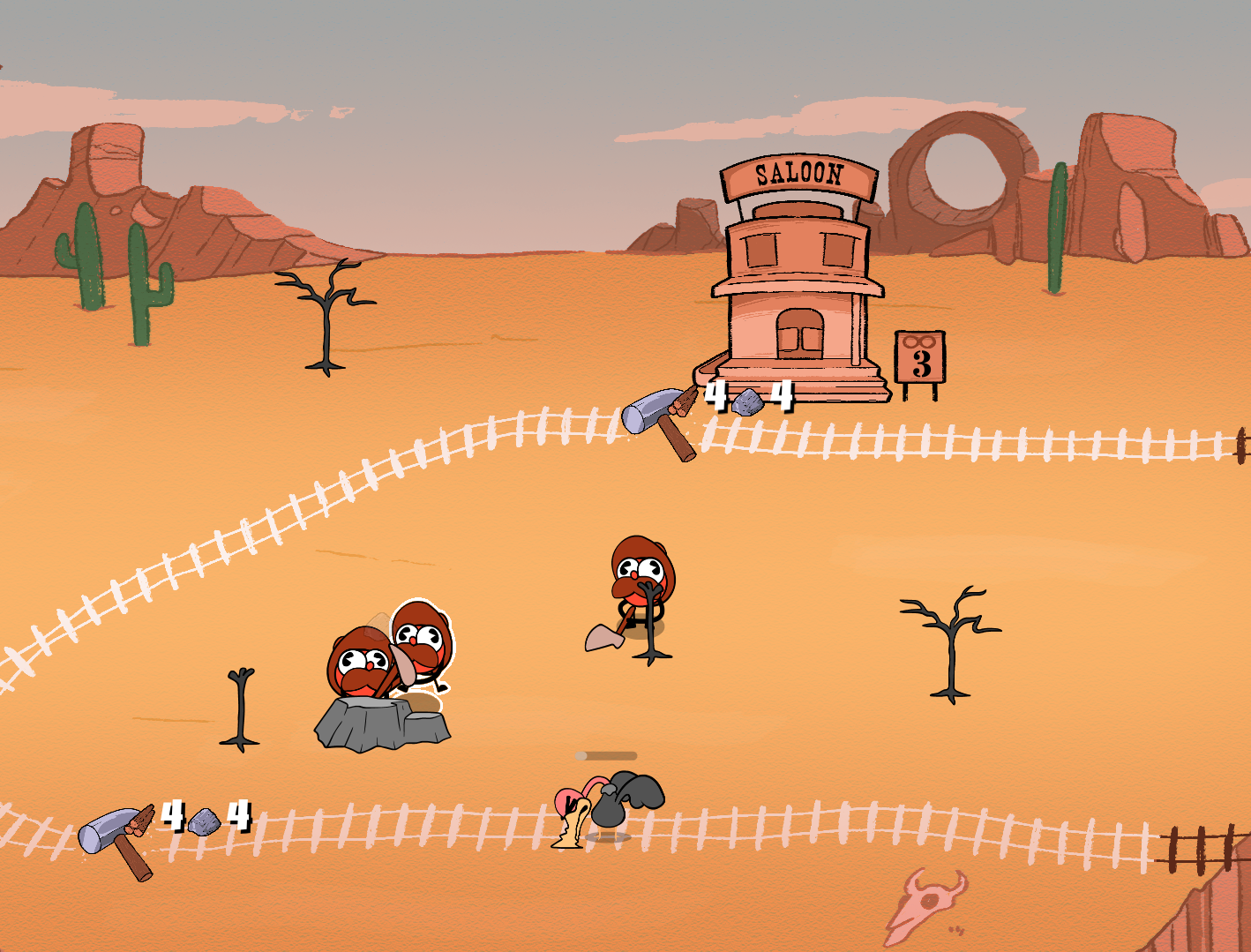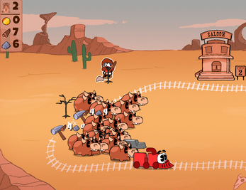 Train - Moves around and around, when it passes the saloon you gain gold equal to the station level. If it encounters any human it will destroy them, but if the rail is broken, it will derail and you'll lose the game.